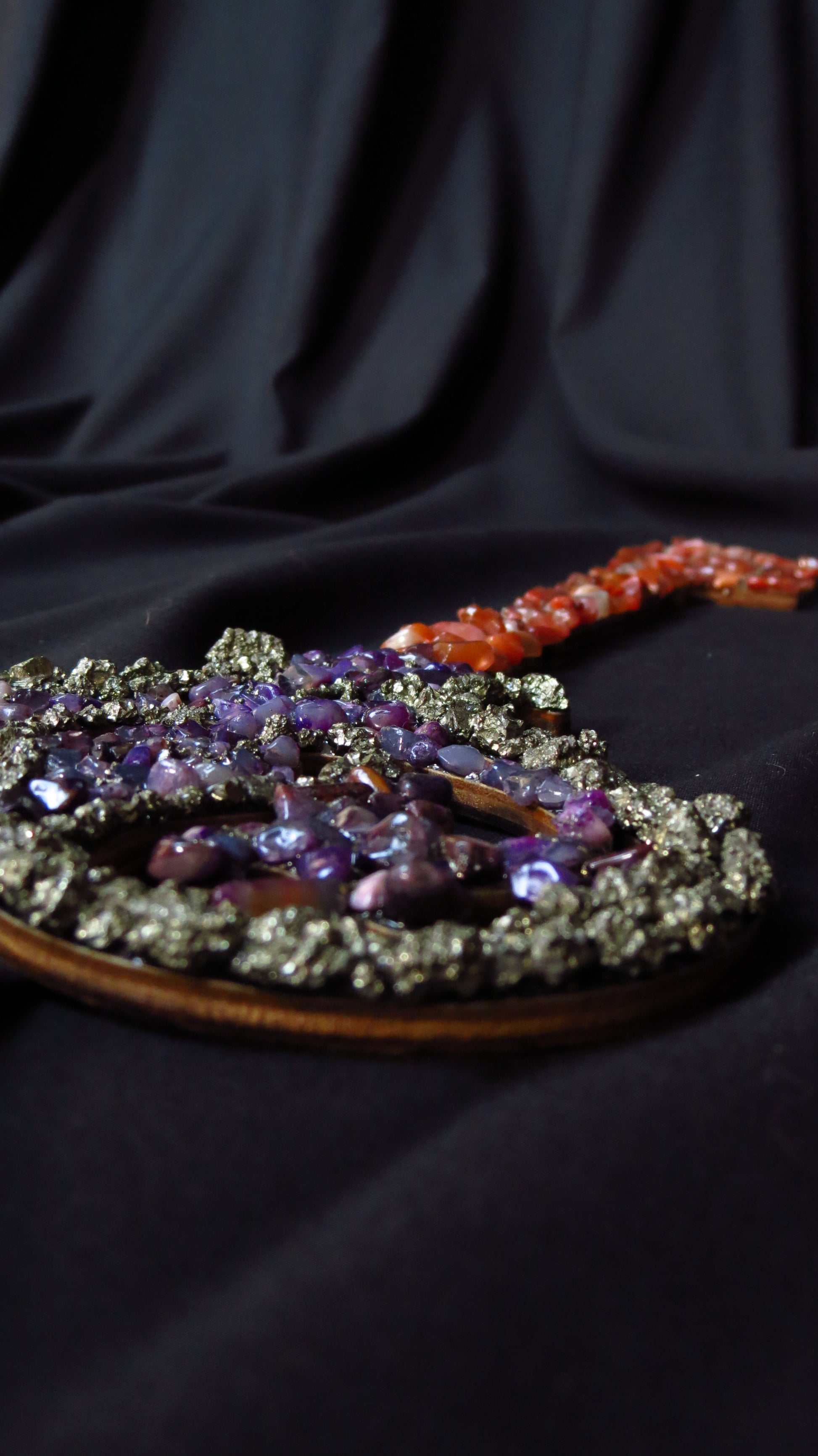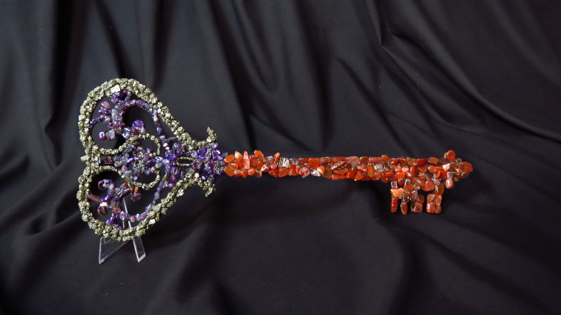 O cheie născută din întâlnirea dintre foc și spirit — roșul carneolului și violetul ametistului, unite de strălucirea aurie a piritelor. „Cheia Inimii Alchimice” simbolizează transformarea interioară, curajul de a deschide noi începuturi și puterea iubirii de sine.