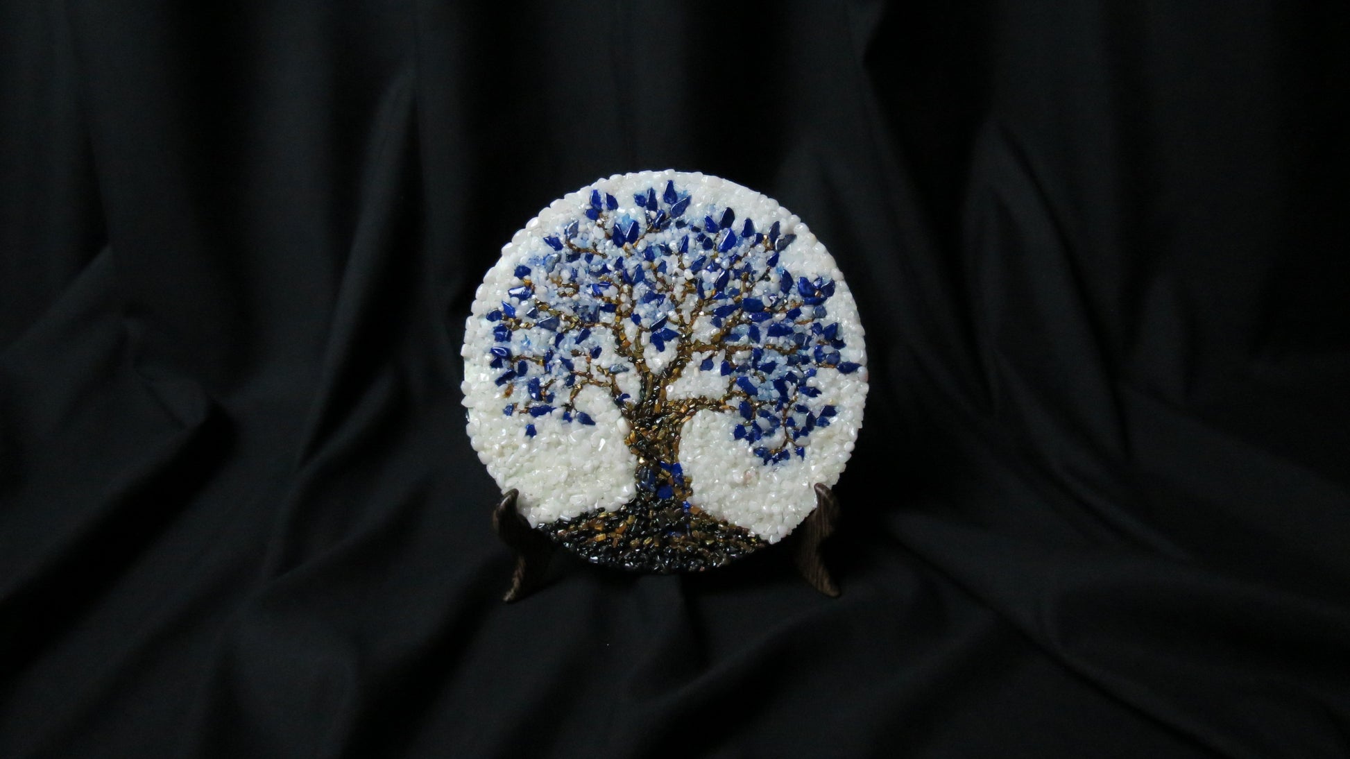 Un arbore care pare crescut din lumină și visare, cu rădăcini de aur și crengi de lapis lazuli. În spatele lui, cercul alb strălucește ca o lună plină, iar fiecare frunză albastră poartă amintirea cerului senin. „Copacul Cerului” este un simbol al speranței, al reînnoirii și al legăturii dintre suflet și univers.